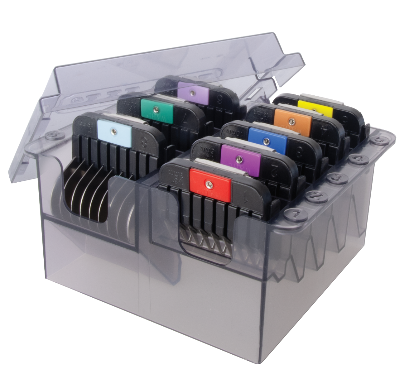 8 Attachment Combs (#1= 3mm, #2= 6mm, #3= 10mm, #4= 13mm, #5= 16mm, #6= 19mm, #7= 22mm #8= 25mm).