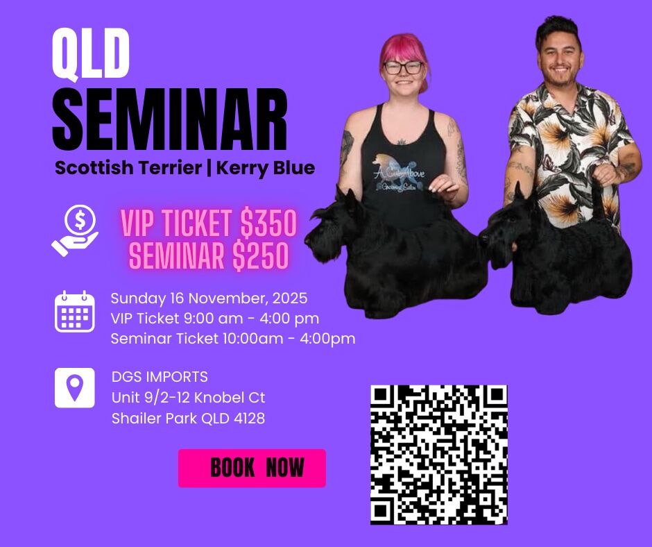 Join renowned Groomers and industry experts Nathan & Kathlena Austin Ncmg for an exclusive seminar at DGS Imports QLD, Specialising in their respective breeds, they’ll demonstrate advanced techniques in Kerry Blue Terrier & Hand stripping.