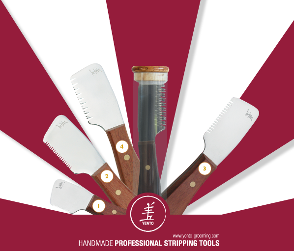 Yento strippers are meticulously handmade by master craftsmen to ensure there are no sharp edges which can damage or cut the coat. Yento strippers feature beautiful hardwood handles which have been ergonomically designed by experienced groomers for maximum comfort and minimum fatigue while stripping. Yento strippers are more expensive than most other stripping knives because they are handmade. The results achieved when using Yento strippers speak for themselves.